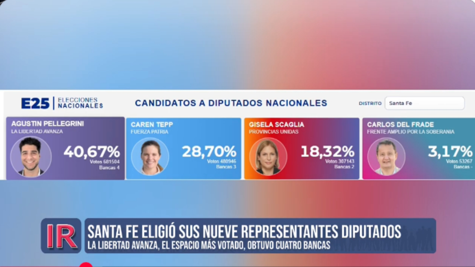 La Provincia de Santa Fe tuvo la elección de nueve diputados nacionales que reemplazarán a partir del 10 de diciembre de 2025 a Germana Figueroa Casas, Luciano Laspina (PRO); Mario Barletta (Unidos); Gabriel Chumpitaz (Futuro y Libertad); Mónica Fein (Encuentro Federal); Melina Giorgi (Democracia para Siempre); Eduardo Toniolli, Magalí Mastaler (Unión por la Patria); y Roberto Mirabella (Defendamos Santa Fe).
