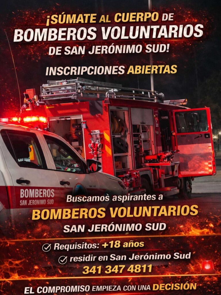 El Cuartel de Bomberos Voluntarios de San Jerónimo Sud abrió la inscripción para quienes deseen incorporarse como aspirantes al cuerpo activo, invitando a vecinos y vecinas de la localidad a formar parte de una institución clave para la comunidad.