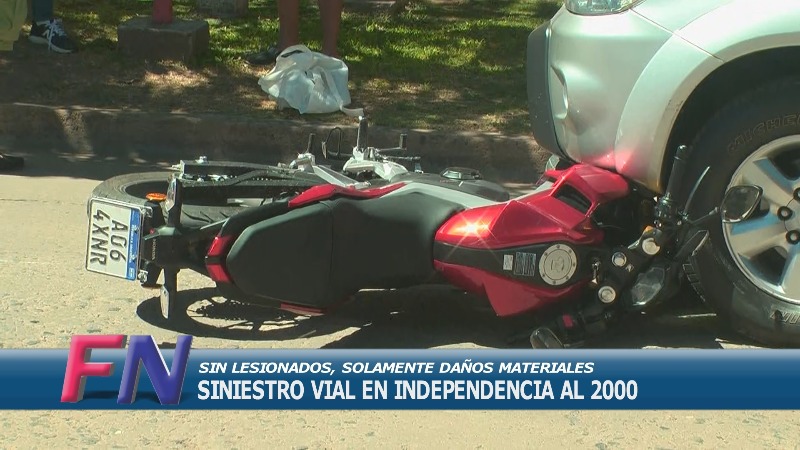 Por causas que se tratan de establecer colisionaron una motocicleta de mediana cilindrada, patente AOG 4XNR, y una camioneta Toyota dominio ITI087. El impacto afortunadamente fue de carácter leve, por lo que tanto el conductor de la pick-up como el motociclista no sufrieron heridas de consideración, quedando todo en un susto y con el consecuente intercambio de papeles.