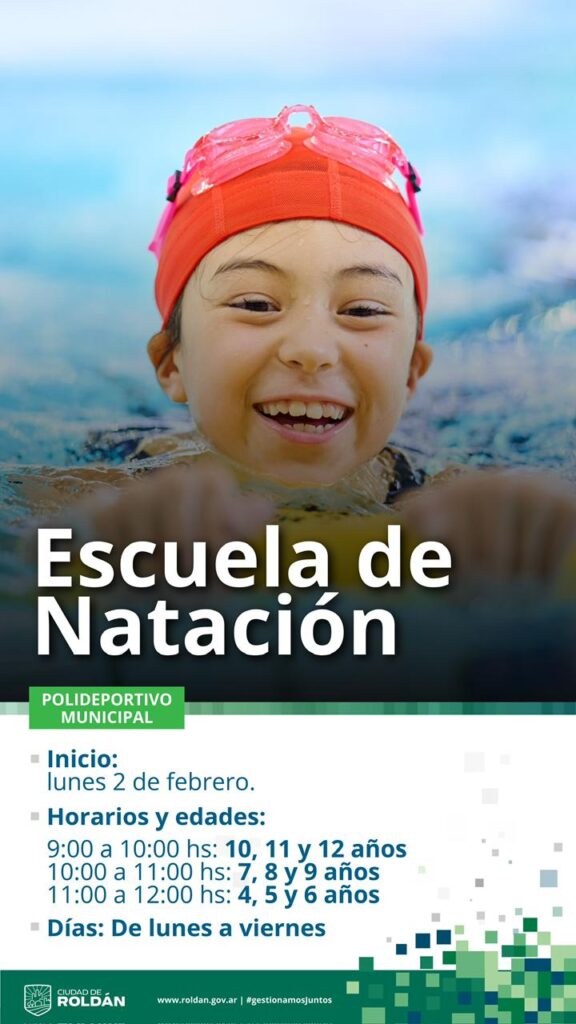 La Municipalidad de Roldán invita a la comunidad a sumarse a la Escuela de Natación, que dará inicio el lunes 2 de febrero en el Polideportivo Municipal, ubicado en Larrea 450. La iniciativa está destinada a niños y niñas de entre 4 y 12 años y busca seguir fortaleciendo el acceso al deporte y a la actividad física desde edades tempranas.