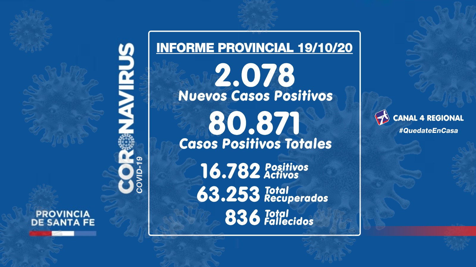 El Ministerio de Salud de Santa Fe, a través de la Dirección Provincial de Epidemiología, informa a la población que en el día de la fecha se han confirmado 2.078 casos nuevos de COVID-19, en el territorio provincial.
