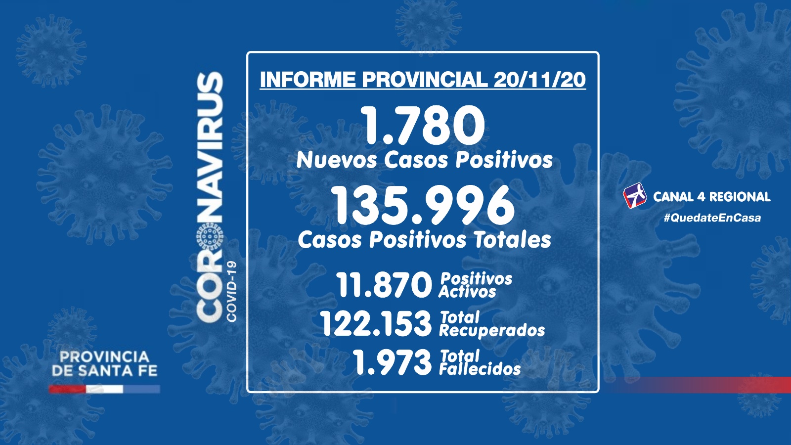 El Ministerio de Salud de Santa Fe, a través de la Dirección Provincial de Epidemiología, informa a la población que en el día de la fecha se han confirmado 1.780 casos nuevos de COVID-19, en el territorio provincial.