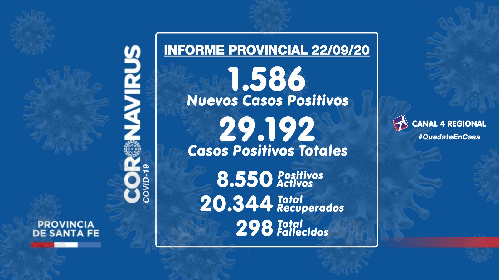 El Ministerio de Salud de Santa Fe, a través de la Dirección Provincial de Epidemiología, informa a la población que en el día de la fecha se han confirmado 1.586 casos nuevos de COVID-19, en el territorio provincial.
