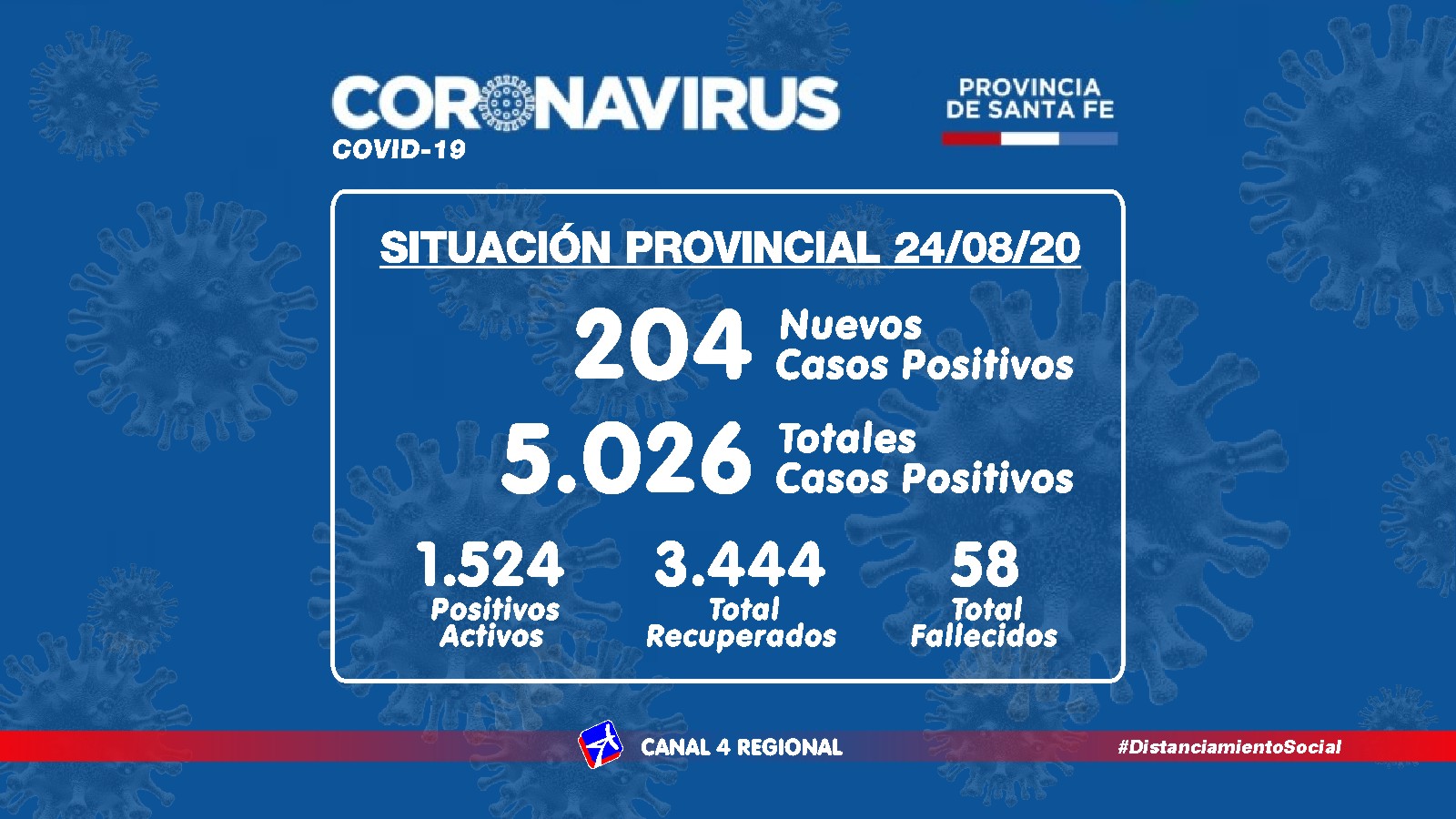 El Ministerio de Salud de Santa Fe, a través de la Dirección Provincial de Epidemiología, informa a la población que en el día de la fecha se han confirmado 204 casos nuevos de COVID-19, en el territorio provincial.