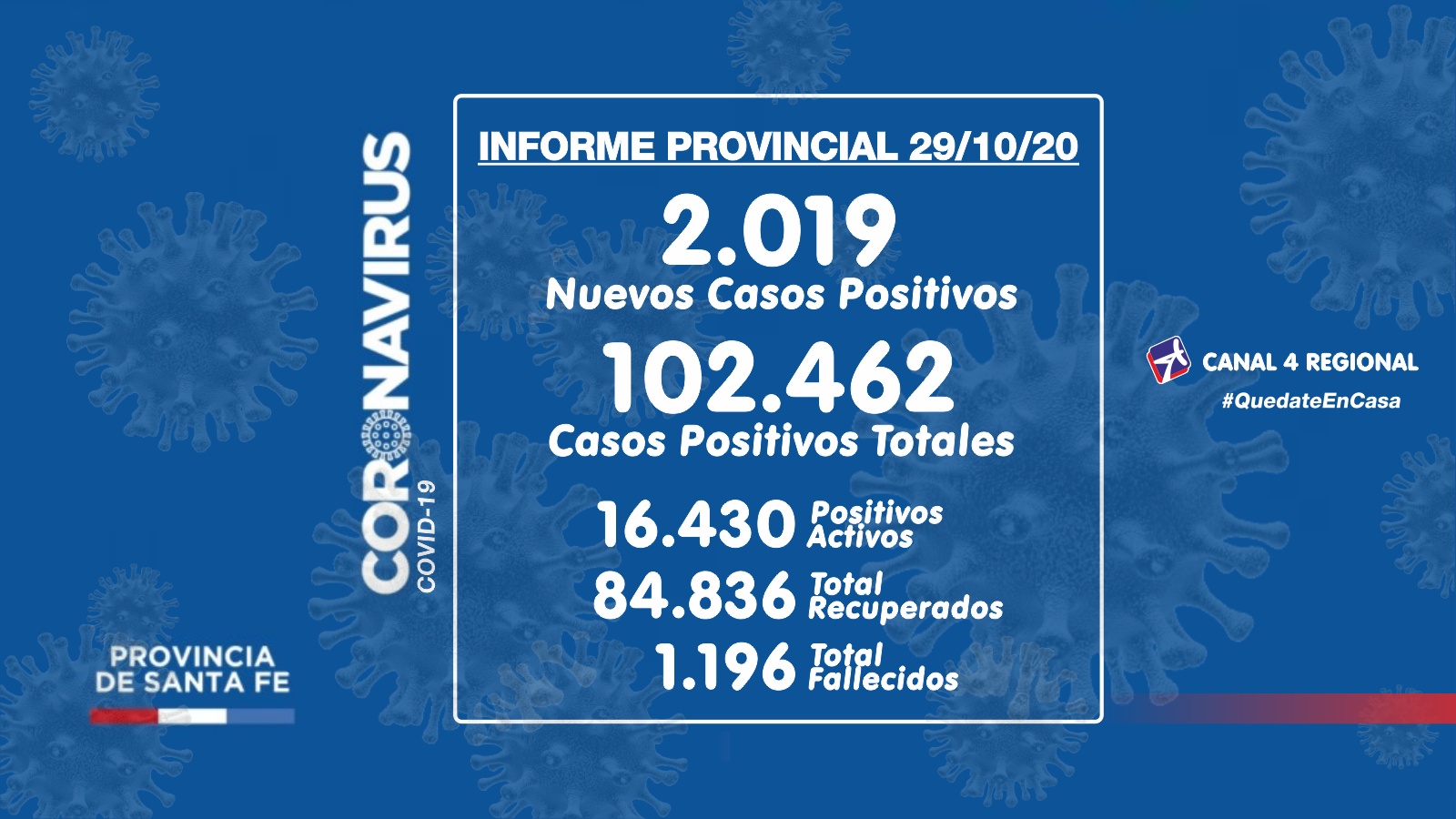 El Ministerio de Salud de Santa Fe, a través de la Dirección Provincial de Epidemiología, informa a la población que en el día de la fecha se han confirmado 2.019 casos nuevos de COVID-19, en el territorio provincial.