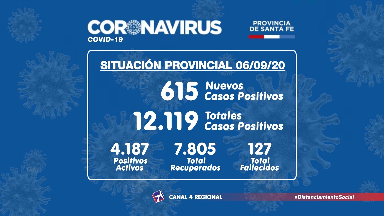 El Ministerio de Salud de Santa Fe, a través de la Dirección Provincial de Epidemiología, informa a la población que en el día de la fecha se han confirmado 615 casos nuevos de COVID-19, en el territorio provincial.