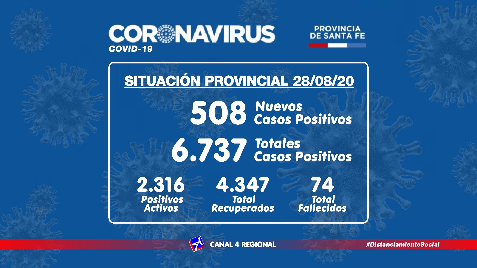 El Ministerio de Salud de Santa Fe, a través de la Dirección Provincial de Epidemiología, informa a la población que en el día de la fecha se han confirmado 508 casos nuevos de COVID-19, en el territorio provincial.