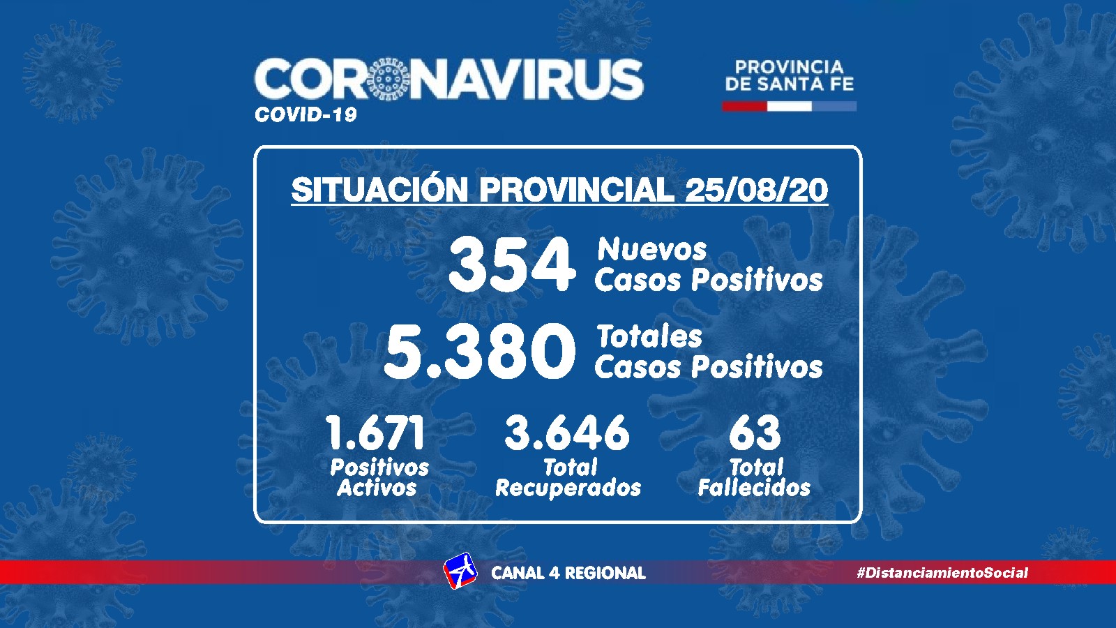El Ministerio de Salud de Santa Fe, a través de la Dirección Provincial de Epidemiología, informa a la población que en el día de la fecha se han confirmado 354 casos nuevos de COVID-19, en el territorio provincial.