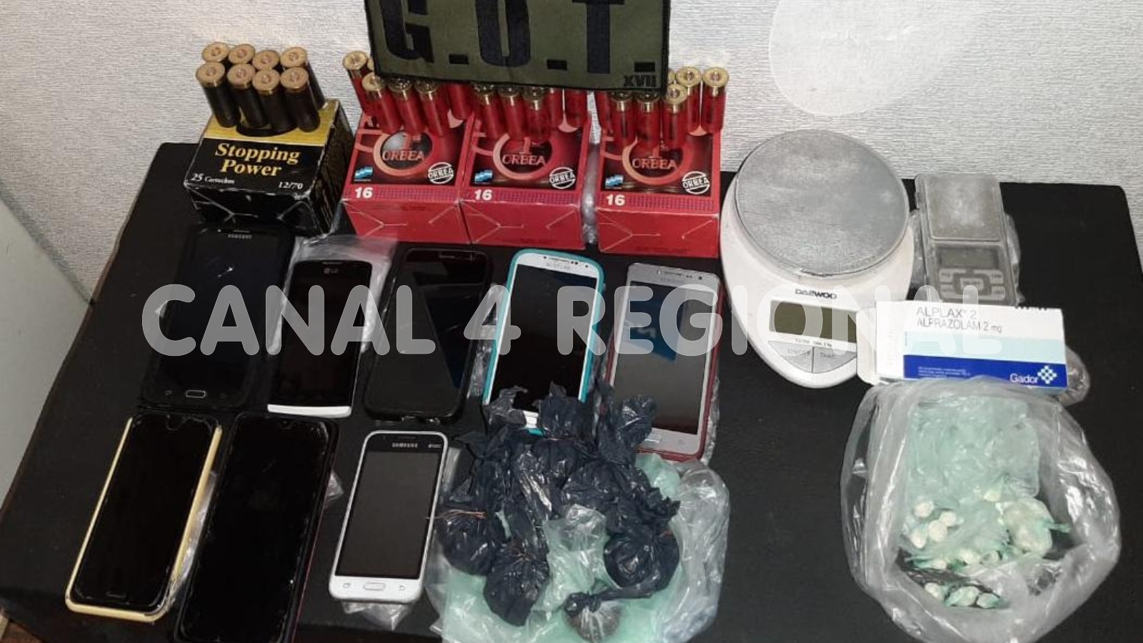 En la vivienda de calle Gálvez se produjo el procedimiento de mayor envergadura donde se secuestraron 24 envoltorios conteniendo cocaína y una bolsa conteniendo una “piedra” también de cocaína, 13 envoltorios conteniendo marihuana fraccionado tanto en bocha como en menudeo, 1 caja de Alplax, 1 balanza de precisión con vestigios, 1 balanza de peso, 75 cartuchos calibre 16 y 25 cartuchos calibre 12.