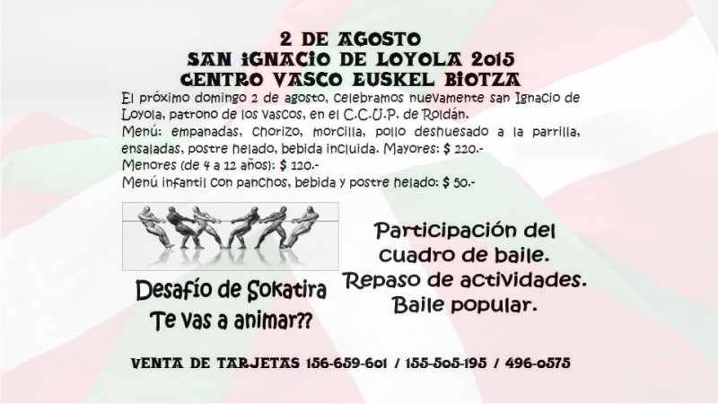 El próximo día domingo 2 de agosto, a partir de las 12:30 hs. y en las instalaciones del Centro Cosmopolita Unión y Progreso, el Centro Vasco Euskel Biotza de Roldán organiza un gran almuerzo en honor a San Ignacio de Loyola, Patrono de los vascos. En dicho festejo podrá disfrutarse además danzas tradicionales, baile popular y un desafío de soka-tira con premiación para los ganadoras. Las tarjetas pueden reservarse a los teléfonos (0341) 156-659601, 155-505195 o 496-0575.