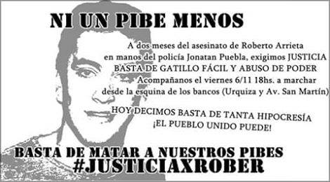 En la tarde del pasado día viernes se llevó a cabo una nueva movilización en solicitud del esclarecimiento del crimen de Roberto Arrieta, el joven aldaense que el 6 de septiembre perdiera la vida en un episodio de gatillo fácil en la ciudad de Puerto General San Martín.