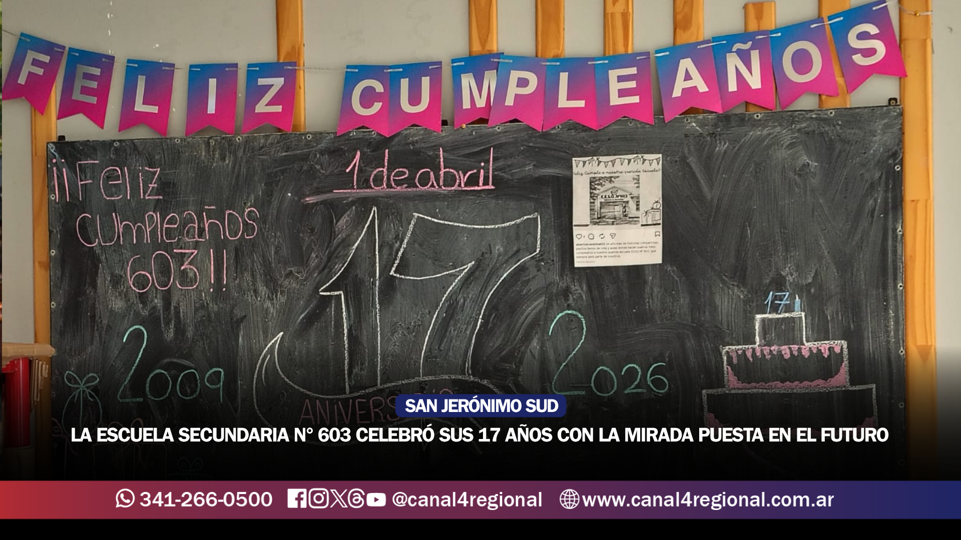 La Escuela de Educación Secundaria Orientada (EESO) n° 603 «Dr. Alberto Brambilla« de San Jerónimo Sud vivió una jornada de celebración y recuerdos al cumplirse 17 años desde que obtuvo su independencia administrativa. Si bien la fecha oficial fue el pasado 1 de abril, los festejos se trasladaron a esta semana para no superponerse con los actos de Malvinas.