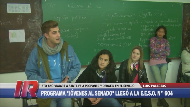 La Escuela de Educación Secundaria Orientada nº 604 de la localidad de Luis Palacios es una de las instituciones educativas que formará parte del programa “Jóvenes al Senado”, donde los alumnos de los cursos superiores podrán diagramar proyectos y conocer la labor legislativa y su mecánica hasta poder presentar sus inquietudes de manera directa en la Cámara de Senadores de Santa Fe en una sesión simulada, con la posibilidad de que en caso de que sus proyectos se aprueben puedan los mismos ser tratados por los legisladores y convertirlos en leyes, resoluciones y demás.