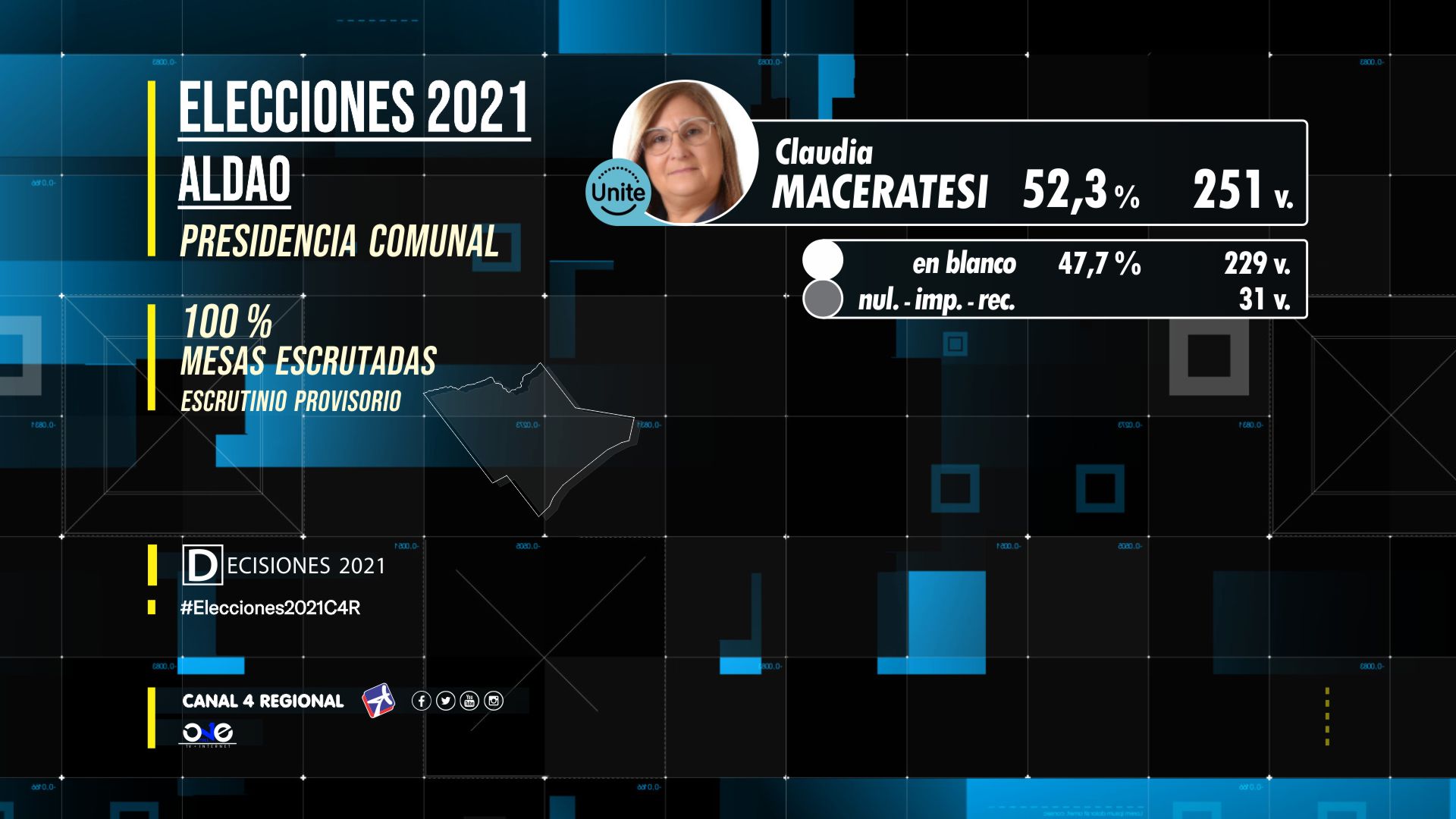 El 81% de los 630 electores aldaenses habilitados fueron quienes concurrieron a las urnas, un 5% menos que lo acaecido en los comicios de 2019. De esta manera el próximo 10 de diciembre Maceratesi dará comienzo a su segundo periodo al frente del Ejecutivo de manera consecutiva.