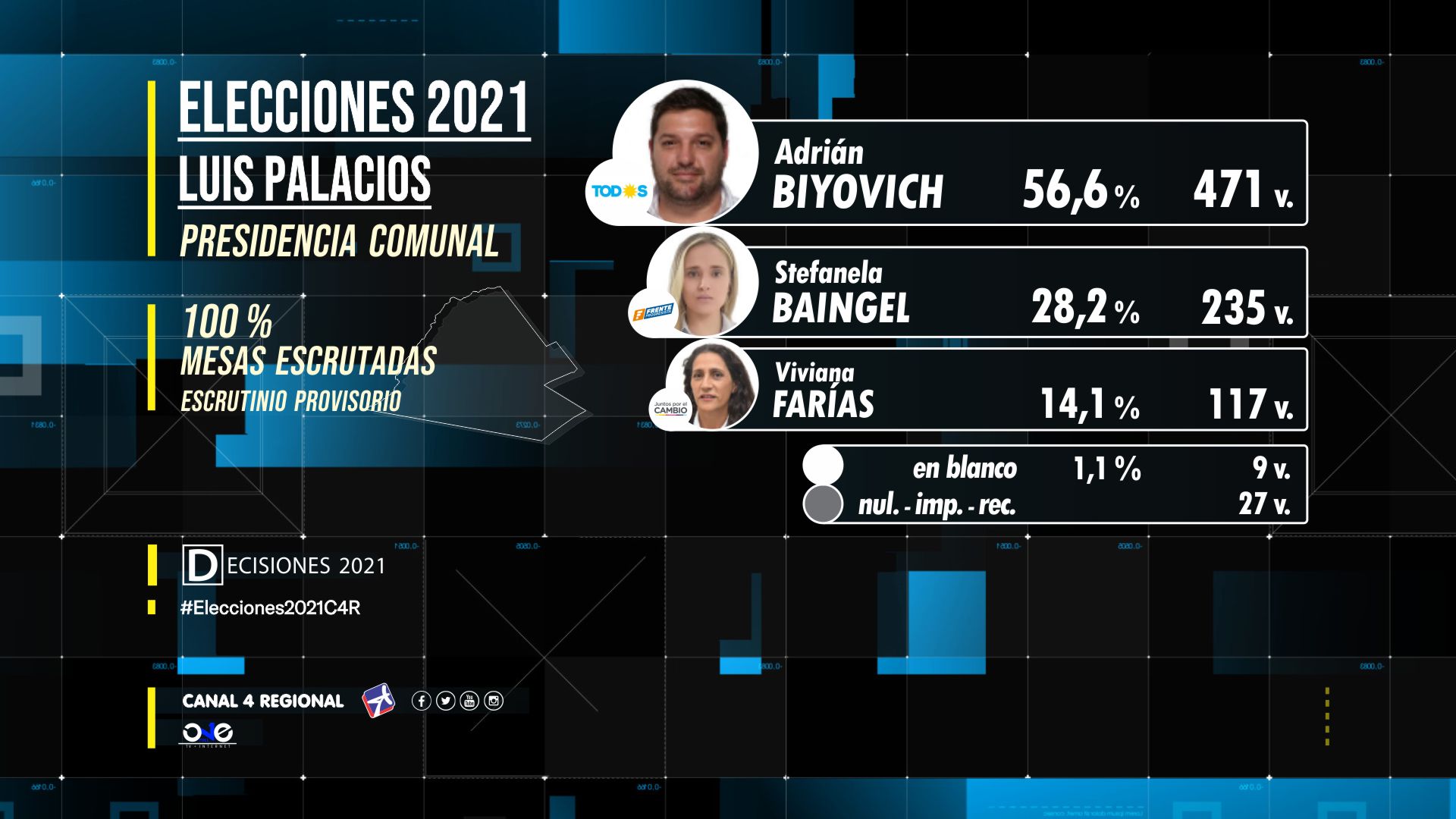 También Adrián Biyovich comenzará en diciembre un nuevo periodo al frente de la Comuna de Luis Palacios, el cuarto de manera consecutiva, ratificando un amplio triunfo que superó el 56% de los votos ante las debutantes Stefanela Baingel y Viviana Farías, en una jornada muy tranquila transcurrida en esta localidad del departamento San Lorenzo.