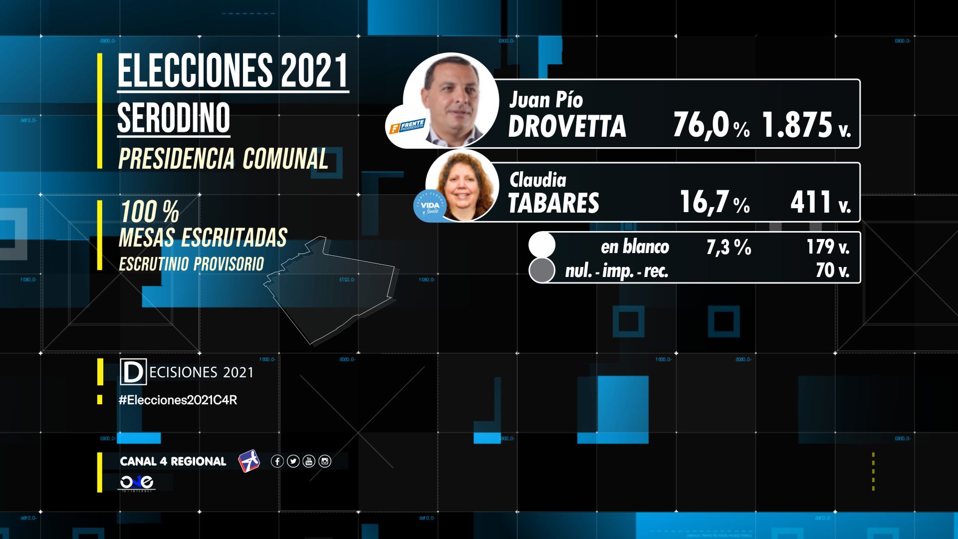 Cómoda victoria de Drovetta en este comicio para de esta manera recibir la confianza popular para dar comienzo en diciembre próximo a su tercer mandato consecutivo. Fue tan contundente el triunfo que el mandatario cosechó el 76% de los sufragios, con una diferencia de casi 60 puntos porcentuales, ante Tabares que señaló su satisfacción por haber podido ingresar como minoría a la comisión comunal. Tan contundente fue la elección de Drovetta que incluso superó el porcentaje obtenido en el 2019 cuando lideró la única lista que se presentó al acto electoral.