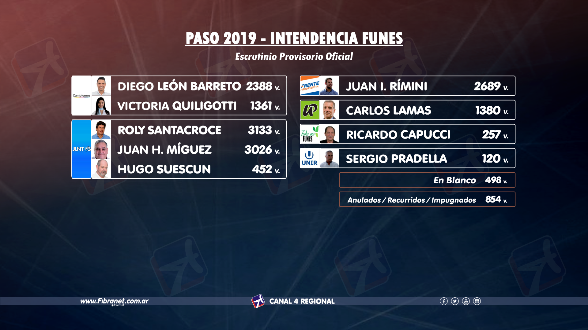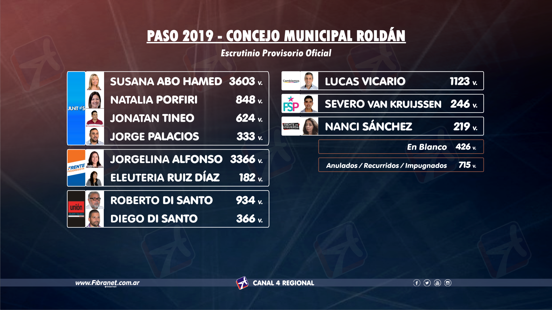 Once listas representando a media docena de partidos originaron tres internas. Por el lado de Juntos, Susana Abo Hamed cuadruplicó a su más inmediata seguidora, Natalia Porfiri, prácticamente monopolizando su lista el comicio y donde únicamente la referente de Unidad Ciudadana se ubica en la misma. Quien arrasó en la interna del FPCyS fue la ex concejal Jorgelina Alfonso, siendo además la segunda más votada en la ciudad detrás justamente de Abo Hamed. En la interna de los Di Santo por Unión Celeste y Blanco, fue Roberto Miguel quien triplicó a su sobrino Diego y también competirá por la tercera banca, como hará Lucas Vicario a través de Cambiemos.