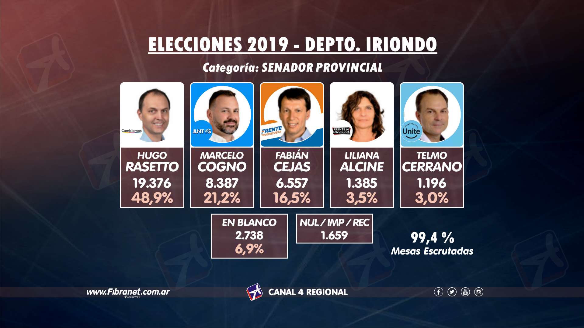 Cinco listas se presentaron en los comicios por el departamento Iriondo, con casi 57 mil electores habilitados distribuidos en dos ciudades y diez comunas, logrando Rasetto el derecho al tercer periodo consecutivo como legislador y manteniendo los números de las PASO, arañando el 49% para duplicar a Marcelo Cogno, de Juntos, y triplicar al presidente comunal de Correa, Fabián Cejas, del Frente Progresista.