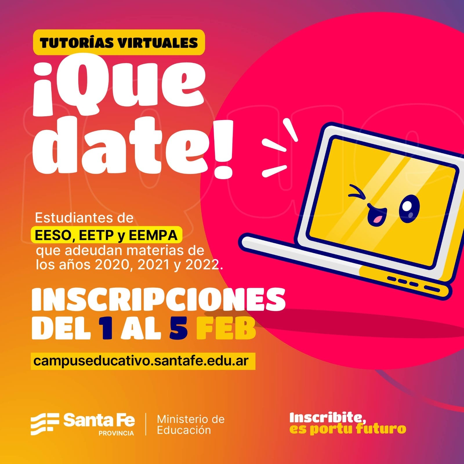 Desde el sábado 1° de febrero hasta el miércoles 5 estará abierta la inscripción al programa “Quedate”, una iniciativa del Gobierno Provincial para que los jóvenes puedan terminar el secundario. Los interesados deberán inscribirse en la modalidad virtual en https://campuseducativo.santafe.edu.ar/ , ingresando al botón “Quedate” y registrándose con su ID ciudadana.