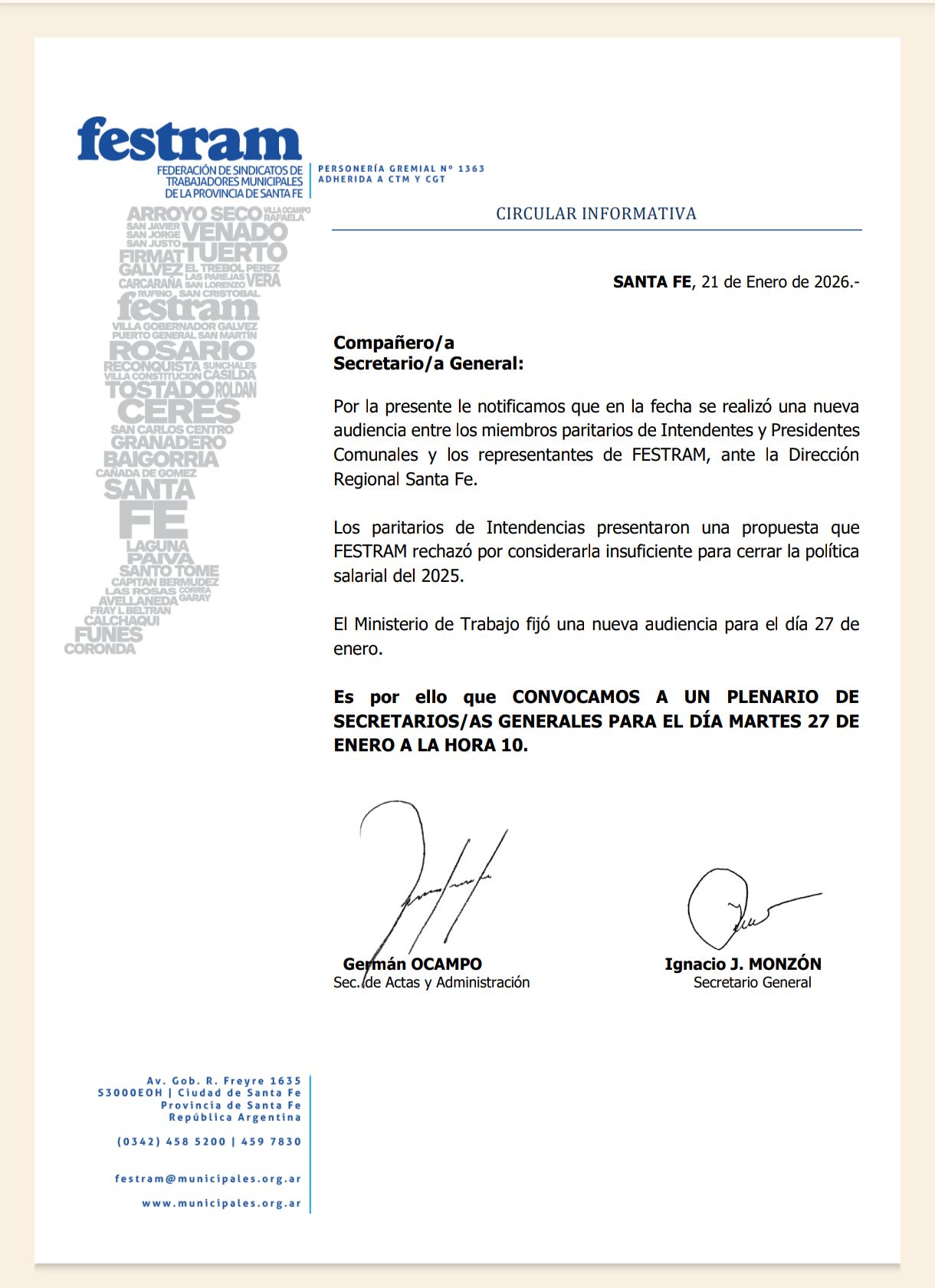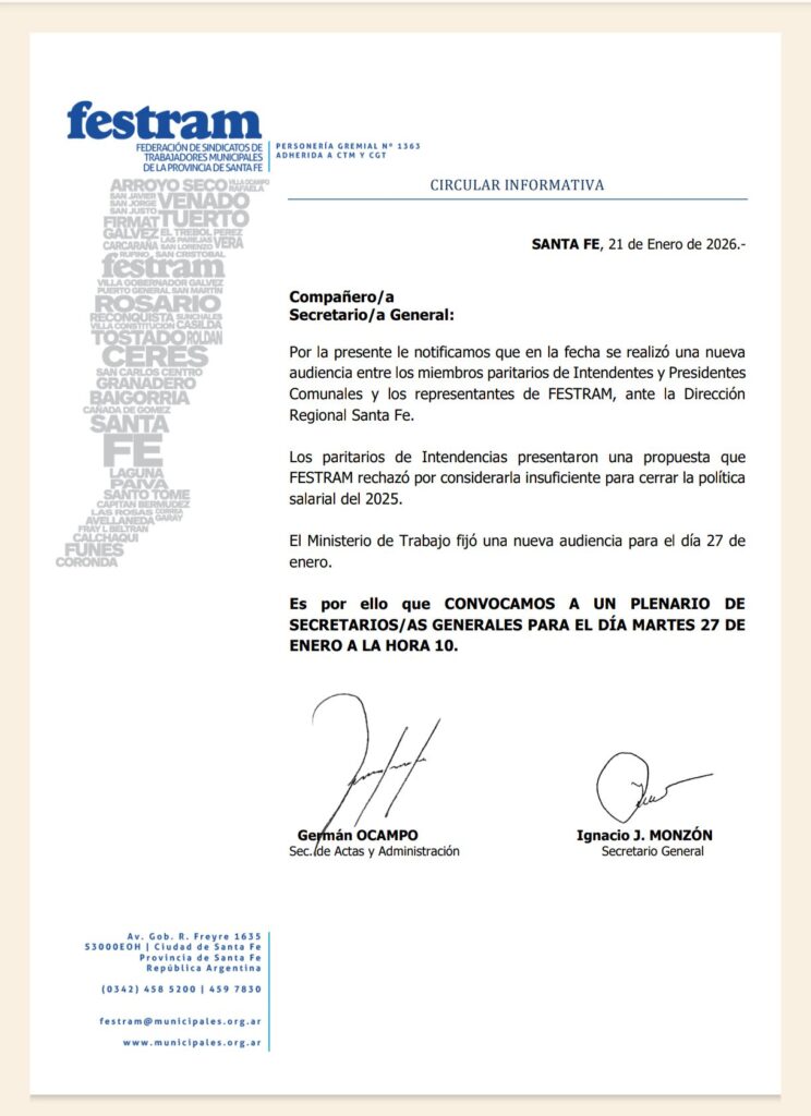 En este marco, desde la conducción de FESTRAM se convocó a un Plenario de Secretarios y Secretarias Generales para el día martes 27 de enero a las 10 horas, instancia en la que se analizará el estado de las negociaciones y se definirán los pasos a seguir en defensa de los derechos salariales de las y los trabajadores municipales de toda la provincia.