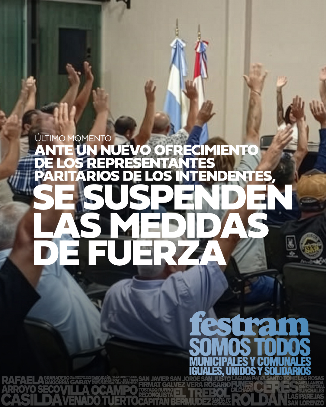 La Federación de Sindicatos de Trabajadores Municipales (FESTRAM) informó que se suspenden las medidas de fuerza previstas para los próximos días, luego de que los representantes paritarios de intendentes y presidentes comunales realizaran un nuevo ofrecimiento salarial en el marco de la negociación en curso.
