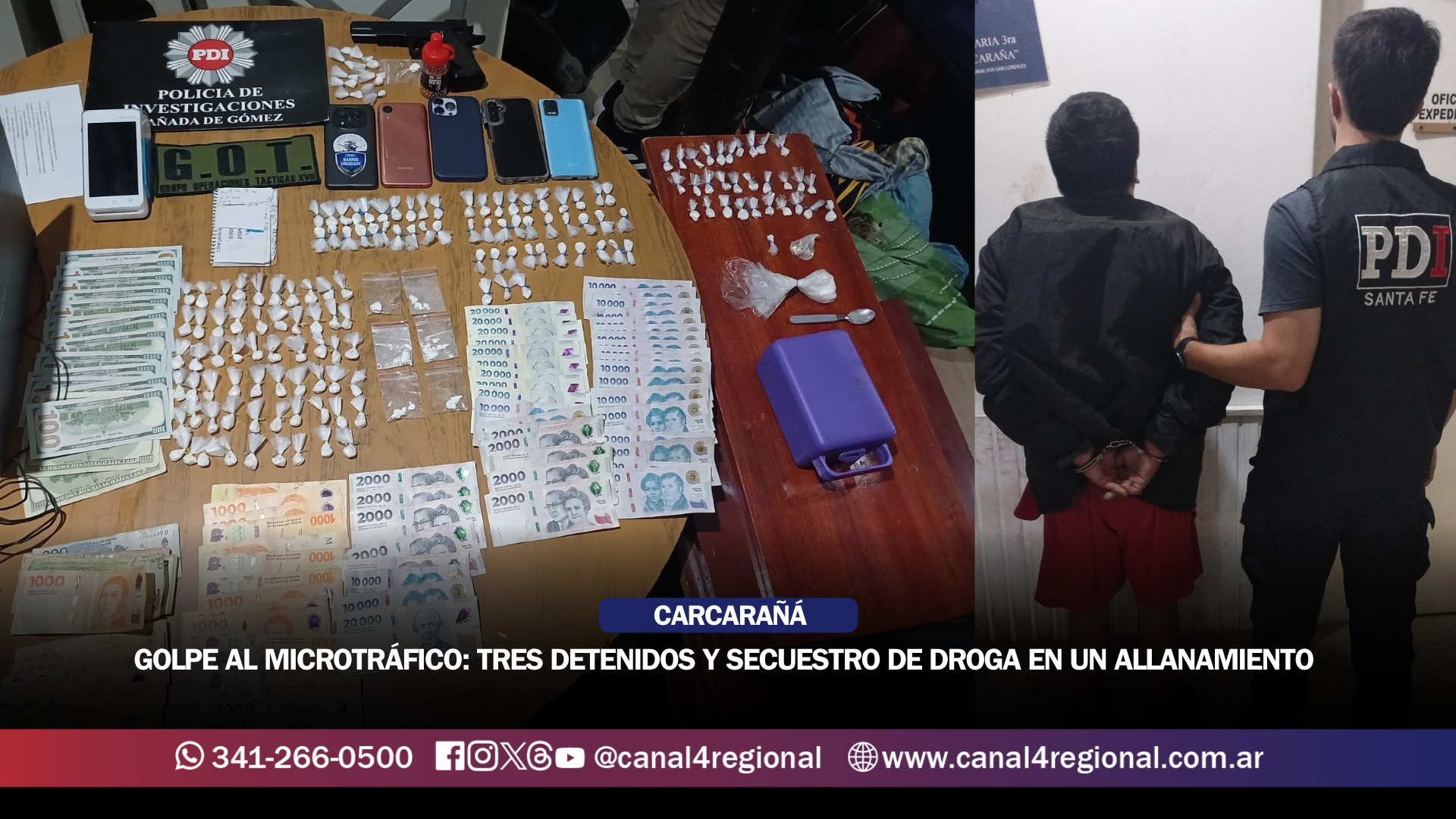 En un operativo llevado adelante por la Dirección General de Policía de Investigaciones (PDI), se logró desbaratar un punto de comercialización de estupefacientes en la ciudad de Carcarañá. El procedimiento, que tuvo lugar este viernes por la noche, culminó con la detención de tres hombres y el secuestro de material estupefaciente y dinero.