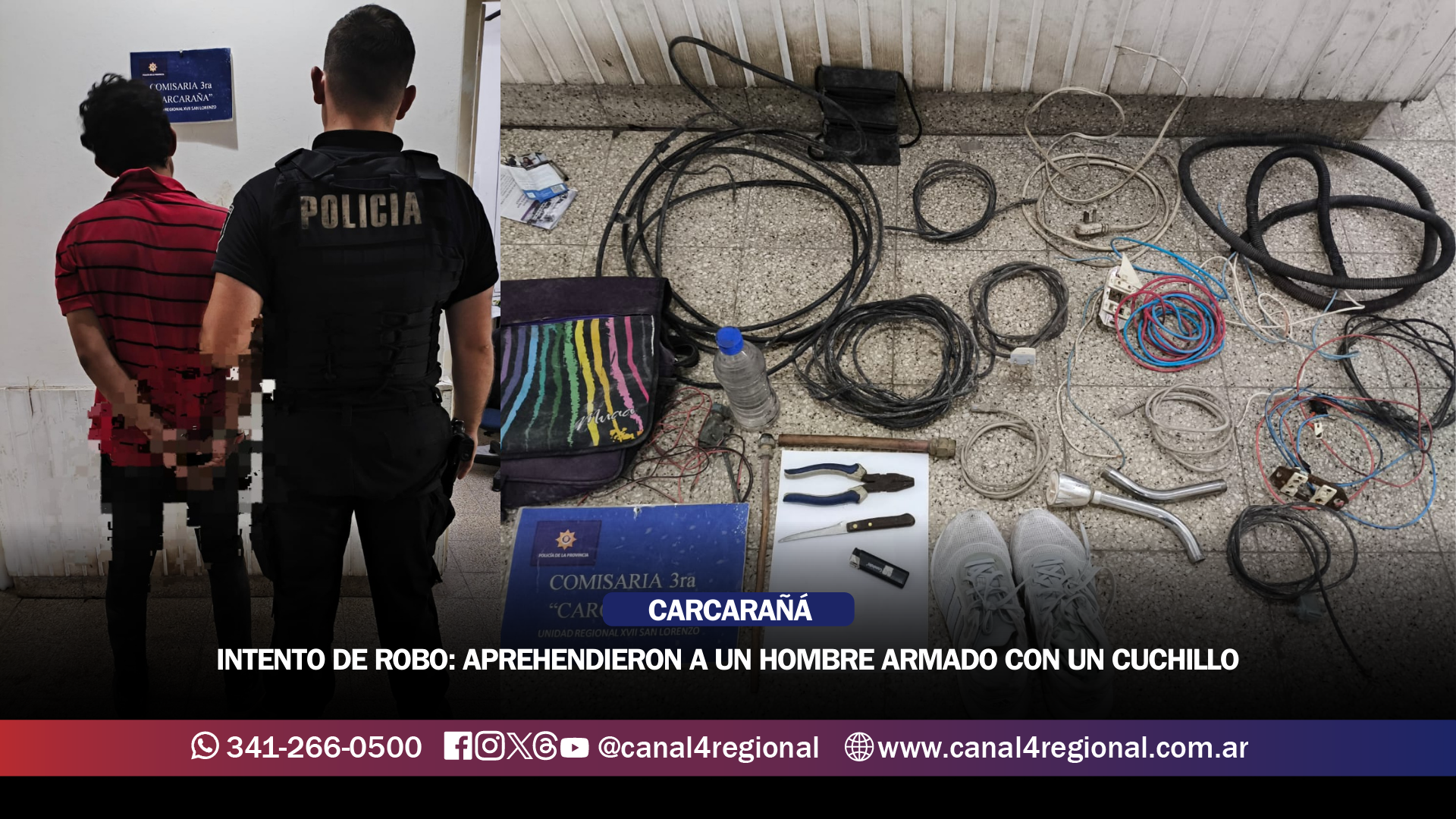 Durante el procedimiento, los agentes le realizaron un chequeo preventivo y hallaron oculto entre sus prendas un cuchillo de aproximadamente 10 centímetros de hoja, el cual fue secuestrado. Además, llevaba un bolso negro que contenía una pinza de trabajo, caños de bronce con tuercas, partes de un flotador de mochila de inodoro, una botella de alcohol, un encendedor, caños cromados de ducha, tomacorrientes, varios rollos de cables y un par de zapatillas.