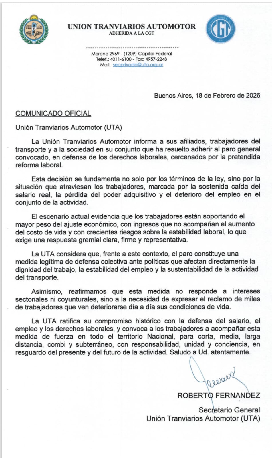 La Unión Tranviarios Automotor (UTA) confirmó que este jueves adherirá al paro general de 24 horas convocado por la CGT, en una jornada clave en la que la Cámara de Diputados dará tratamiento al proyecto de reforma laboral.