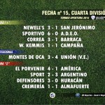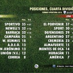 En la vereda de enfrente, el Atlético San Jerónimo visitó a Newell’s de Cañada de Gómez. En Cuarta División fue triunfo de la Topadora por 3 a 1, donde Newell’s lucha por un lugar para las semis mientras que el Suizo ya se despidió de la lucha. En Primera División fue empate 1-1, con goles de Terré para el local y de Diego “Chupete” Martín para el Atlético, que no pudo capitalizar el empate entre Correa y Barraca, sus rivales directos, quedando todos en el cuarto lugar con 20 puntos aunque el elenco de Pablo Fiori es el mejor ubicado por la diferencia de gol.