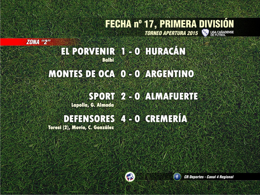 En La Tapera y ante Huracán de Bustinza, El Porvenir continuó con su marcha triunfal en ambas divisiones, las cuales ya obtuvieron el pasaporte a la próxima fase. En el preliminar, gran goleada por 5-0 para transformarse en el equipo con el mayor puntaje en este 2015. En Primera División, Alan Balbi le dio el triunfo al Rojiverde, que culminó el partido con 9 hombres luego de la expulsión de Sergio Robledo y la lesión de Enzo Cantoia cuando ya había agotado los cambios. Con esta victoria, El Porvenir se aseguró el segundo puesto en la tabla general, lo que se traduce en localía en cuartos de final y en una hipotética semifinal.