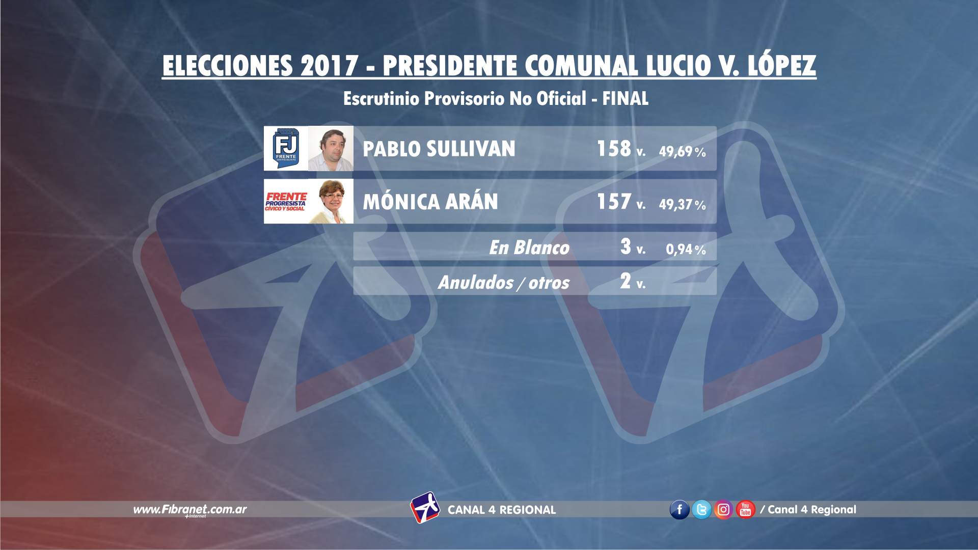 Un virtual empate técnico pero con un mínimo margen de ventaja favorable para el actual presidente comunal Pablo Sullivan (Frente Justicialista), quien se habría impuesto en el acto comicial sobre Mónica Arán (Frente Progresista Cívico y Social).