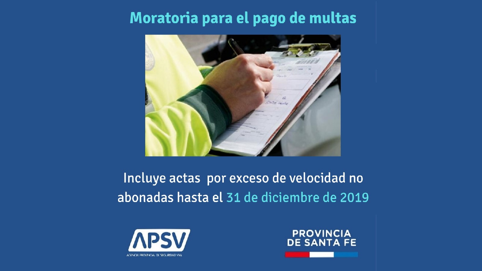 La Agencia Provincial de Seguridad Vial (APSV), dependiente del Ministerio de Seguridad, estableció una moratoria para habilitar el pago de las infracciones que se encuentran en el Sistema de Juzgamiento de Actas de Infracción provincial (SIJAI), por exceso de los límites máximos y mínimos establecidos, que no hayan sido abonadas hasta el 31 de diciembre de 2019.