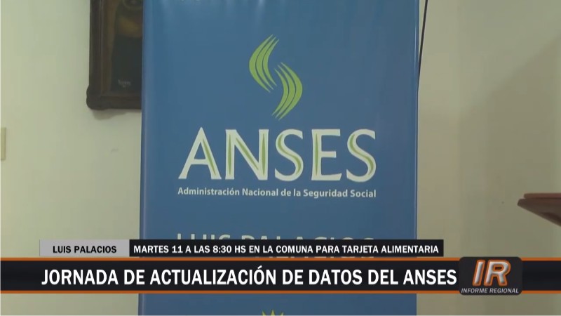 El próximo martes 11 de febrero, la Administración Nacional de Seguridad Social estará efectuando un nuevo operativo en la localidad de Luis Palacios, consistente en la oportunidad de una actualización de datos, jornada la cual se desarrollará entre las 8:30 y las 12:30 horas.