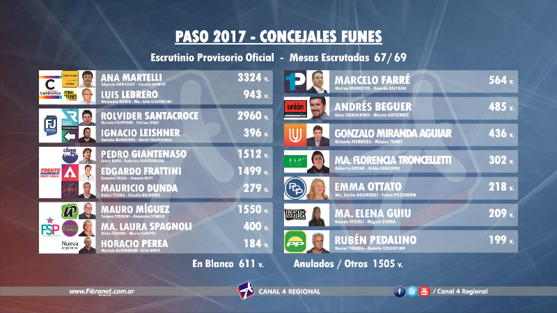 La agrupación Cambiemos fue quien más votos cosechó en la sumatoria: 4267, el 26,5% de las voluntades funenses. La oficialista Anita Martelli fue la gran ganadora de la jornada con 3324 votos, el 78 % de la interna, casi cuadruplicando los números de su rival Luis Lebrero (943), e incluso siendo la persona más votada en la ciudad.