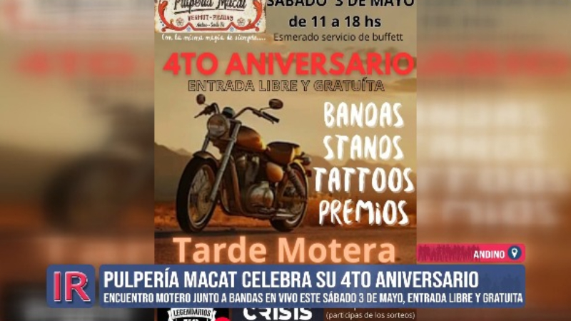 El apasionante rugir de los motores se hará sentir el próximo sábado 3 de mayo, en la localidad de Pueblo Andino, en un lugar que es un punto habitual de los fierreros como lo es la Pulpería Macat que estará celebrando su cuarto aniversario, con la misma magia de siempre, con la Tarde Motera.