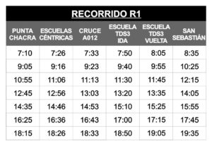 El R1 tiene su recorrido al sur de la ex RN9, excepto en sus ingresos al casco céntrico y al cementerio. Inicia su periplo en Martín Fierro y El Palenque, en Punta Chacra, y culmina en Ruta 9 y San Sebastián, teniendo sus puntas de línea en el cementerio y en Avda. Tierra de Sueños y Fortaleza, en Tierra de Sueños 3.