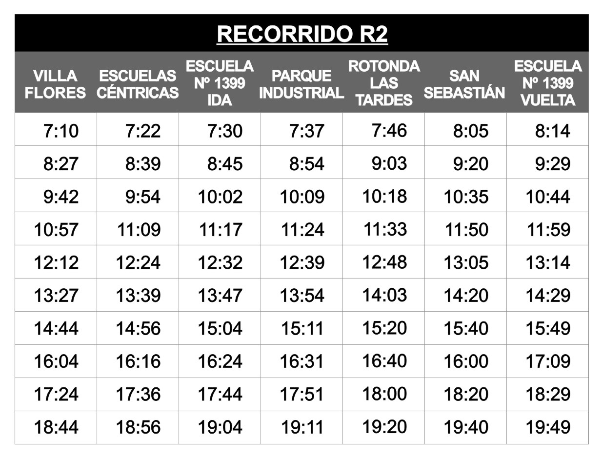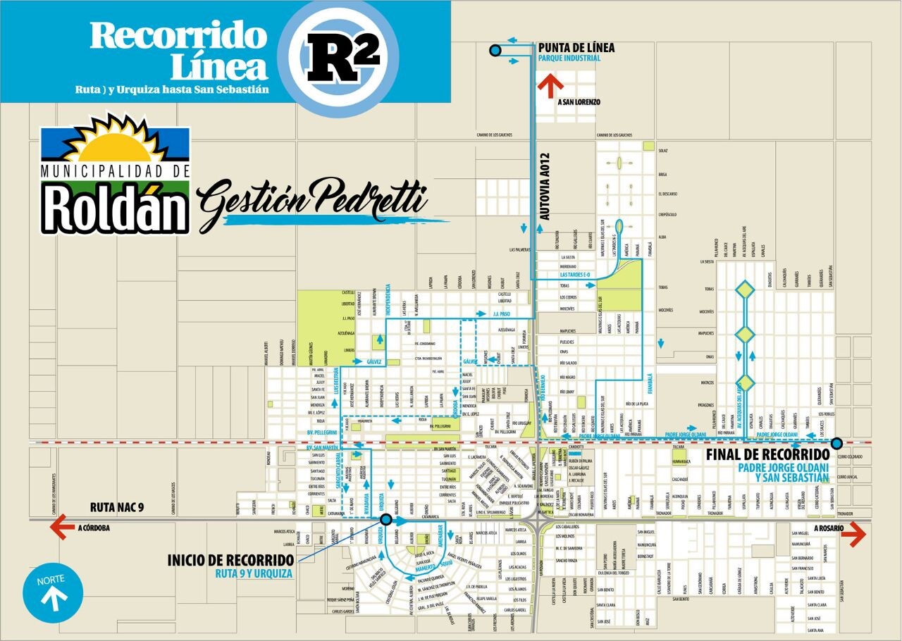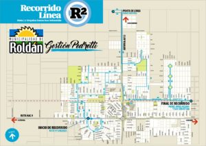 En tanto, el R2 circula al norte de la ex RN9, iniciando su recorrido en Ruta 9 y Urquiza y finalizando en la esquina Padre Jorge Oldani y San Sebastián. Su punta de línea se encuentra ubicada en el Parque Industrial.
