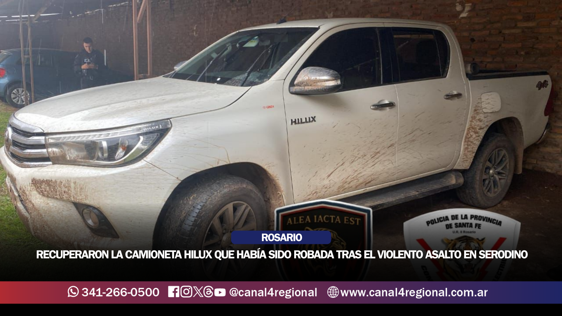 A menos de 24 horas del violento robo calificado ocurrido en la localidad de Serodino, fuerzas de seguridad lograron dar con el paradero de la camioneta Toyota Hilux blanca que era intensamente buscada. El hallazgo se produjo en la ciudad de Rosario, tras un operativo de control en un estacionamiento privado.