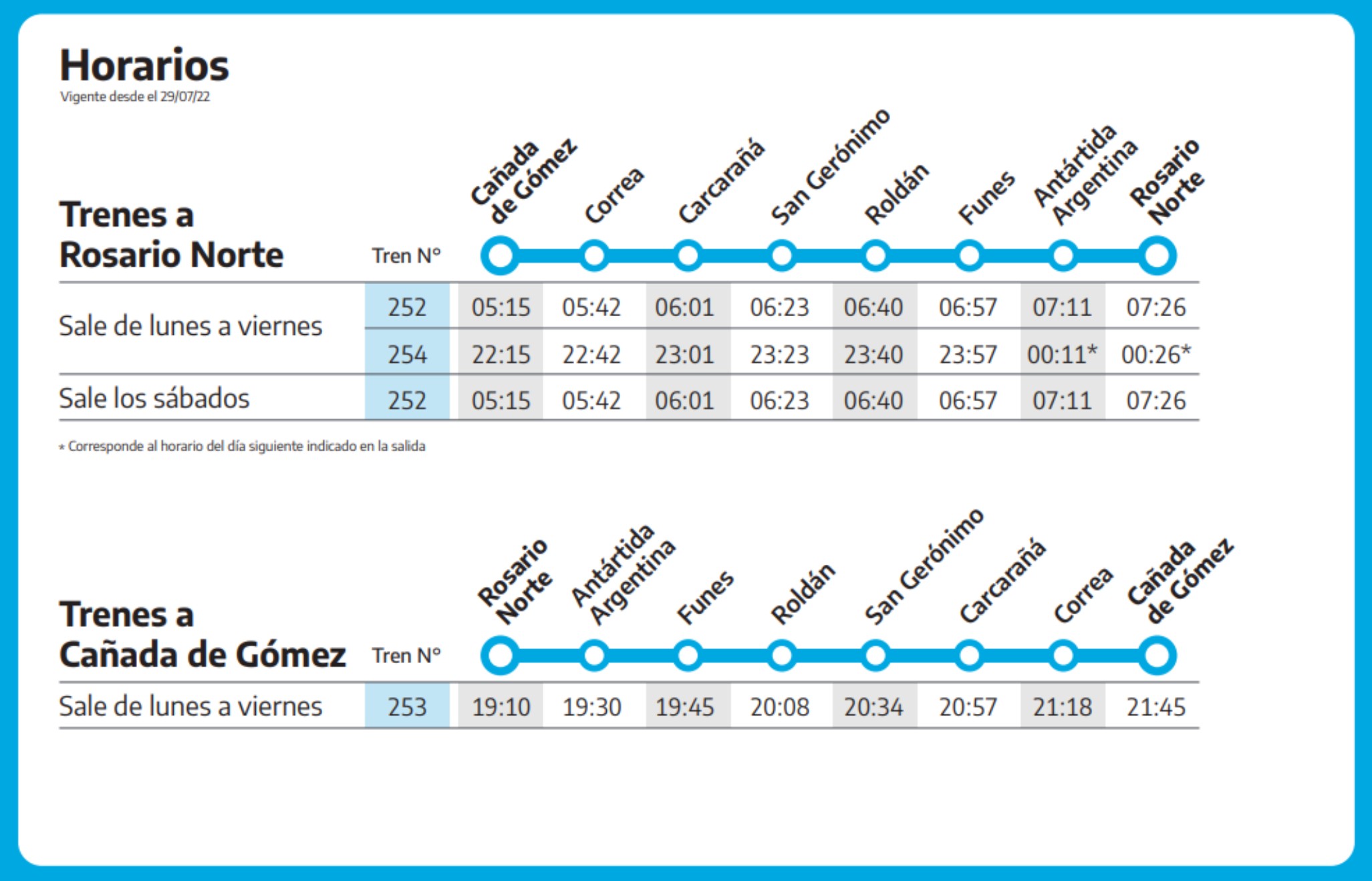 Poco después de las 9:30 horas partió la formación de Trenes Argentinos desde la estación Rosario Norte para detenerse en Fisherton, Funes y Roldán, pasar por San Jerónimo Sud y volver a detenerse en Carcarañá y Correa, localidad donde se subieron el presidente Alberto Fernández y el ministro de Economía Sergio Massa hasta llegar a Cañada de Gómez donde se efectuó el acto principal de esta jornada.