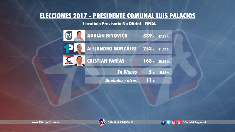 El actual mandatario Adrián Biyovich (Frente Justicialista) se impuso con claridad en el escrutinio provisorio sobre Alejandro González (1 Proyecto Santafesino) y Cristian Farías (Cambiemos), por lo que a partir del 10 de diciembre próximo iniciará su segundo mandato consecutivo al frente del Ejecutivo local.