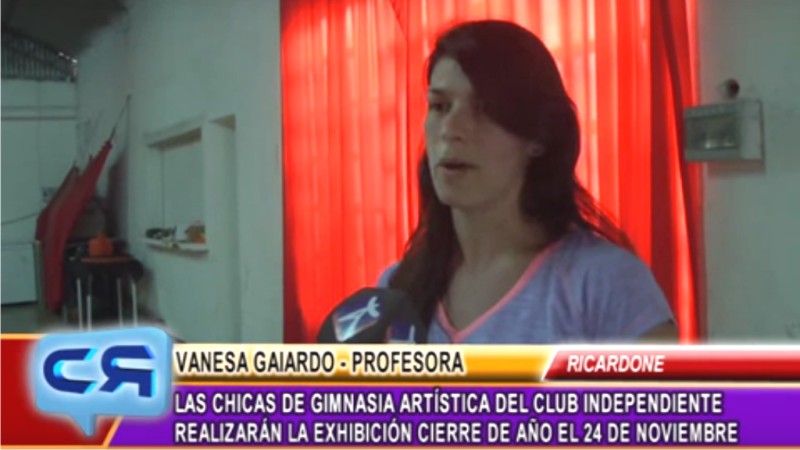 La Gimnasia Artística del Club Atlético Independiente de Ricardone, a cargo de la profesora Vanesa Gaiardo, también está transitando ese camino, ajustando los diversos pormenores de cara a la gran exhibición que estarán realizando el domingo 29 de noviembre, donde los alumnos estarán llevando a cabo diversas figuras como coreos, salto y acrobacias, entre otras.