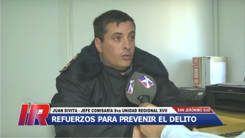 El oficial Juan Divita, titular de la Seccional 8ª de la Unidad Regional XVII con asiento en San Jerónimo Sud, indicó que, luego de las gestiones realizadas tras la ola delictiva que asoló la localidad días atrás, se ha obtenido un incremento tanto en el recurso humano como material para reforzar la seguridad.