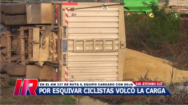 El mismo sucedió en el km. 337 de la Ruta Nacional nº 1V09, la antigua Ruta 9, cuando un camión Fiat Cargo con acoplado, cargados ambos con soja, proveniente de Córdoba y con rumbo a Puerto General San Martín, debió realizar una brusca maniobra para evitar colisionar con tres ciclistas que se desplazaban por la vía asfáltica, para primero volcar y luego culminar su raid en el zanjón aledaño a la banquina.