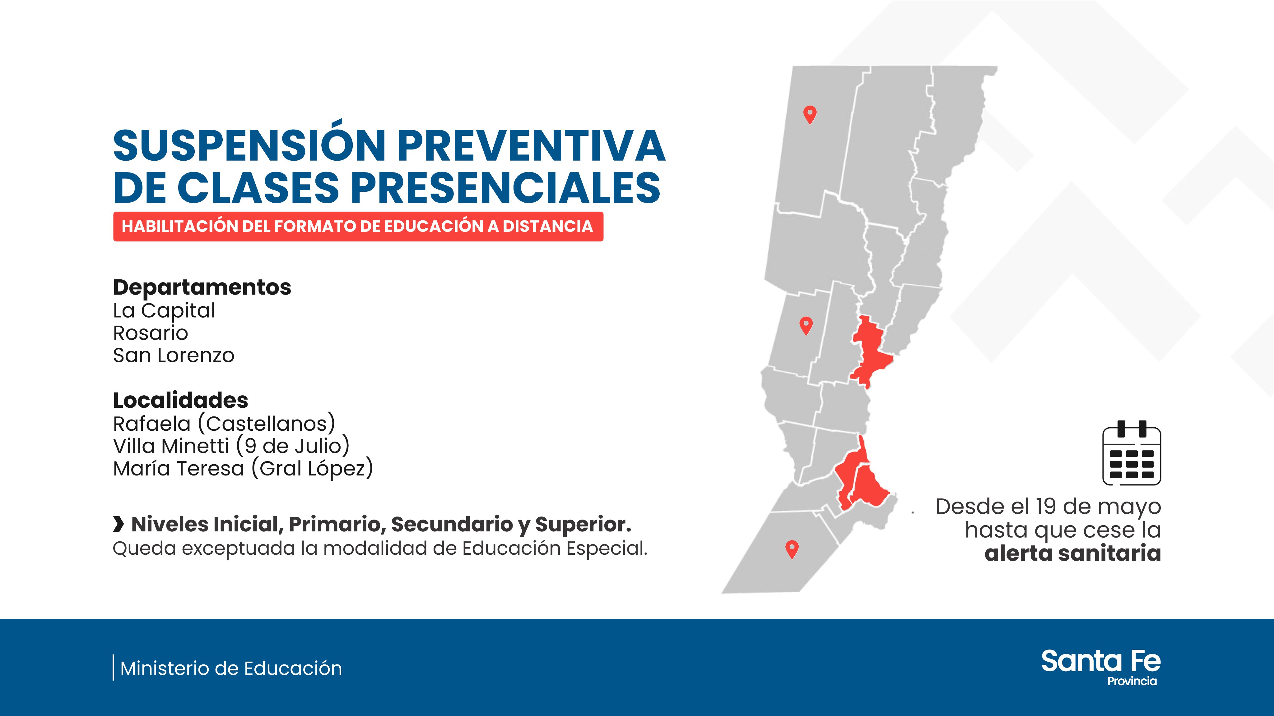 - Art. 1°) – Establecer la suspensión de clases presenciales en los Niveles Inicial, Primario, Secundario y Superior como respecto de sus Modalidades Educativas asociadas, a excepción de la Modalidad Especial, desde el 19 de mayo del corriente hasta que este alerta perdure, en los Departamentos La Capital, Rosario, San Lorenzo y en las localidades de Rafaela, Villa Minetti y María Teresa, atento al grado de alerta sanitaria registrada. Durante este período, los edificios escolares permanecerán abiertos con concurrencia del Personal Directivo y del personal docente para mantener el vínculo pedagógico organizados por equipos mediante el espacio virtual o de consultas en pequeños grupos con distribución de materiales impresos, mientras que los servicios asistenciales a las alumnas y alumnos se suministrarán conforme las modalidades que operaban bajo el mismo formato no presencial.