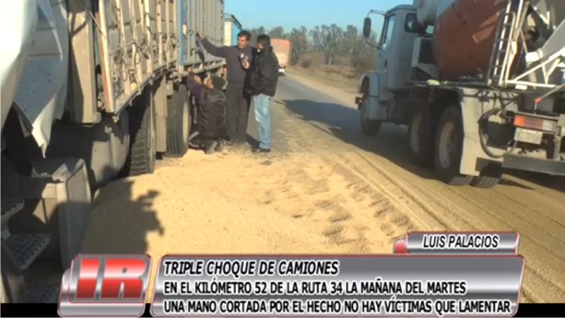 En la mañana del pasado martes 16 de mayo se registró un nuevo accidente de tránsito en el trazado de la Ruta Nacional nº 34. El mismo ocurrió en el kilómetro 52 de la mencionada traza, en jurisdicción de la localidad de Luis Palacios y en cercanías del cruce con la Ruta A012, en sentido a San Lorenzo. Allí colisionaron tres camiones que transportaban cereales. El primero de ellos tuvo que frenar de manera brusca para evitar un impacto, maniobra la cual no pudieron repetir los otros dos rodados.