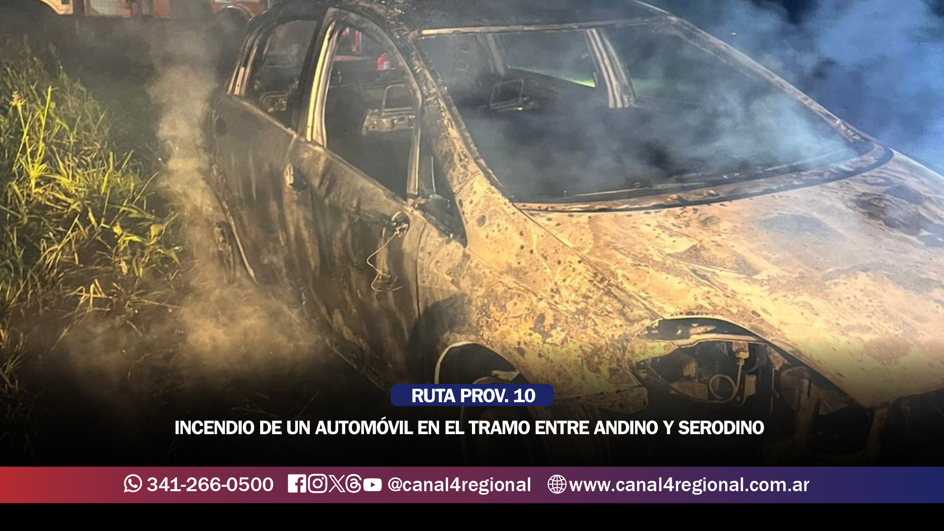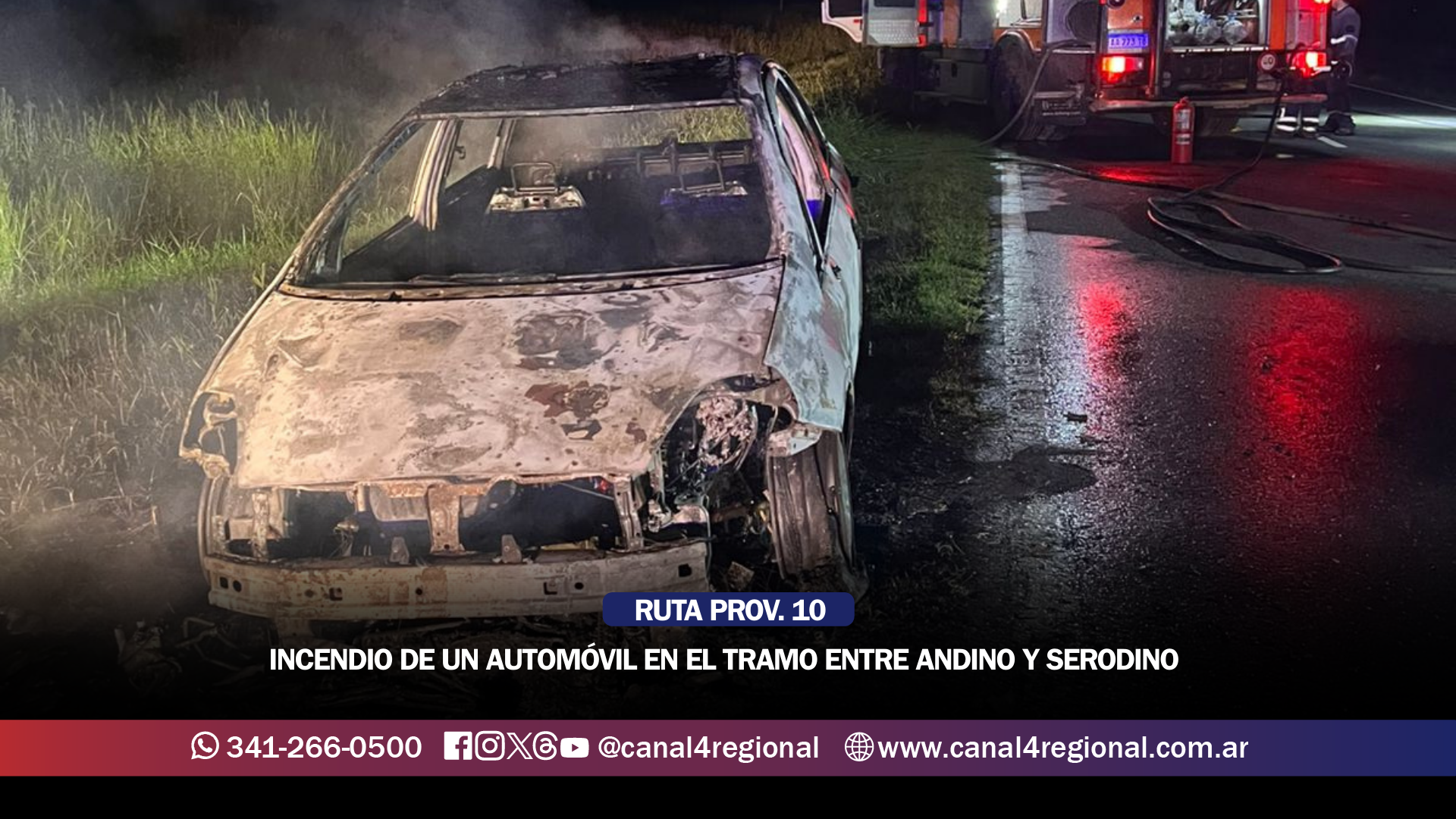 En horas de la noche de ayer martes 10 de febrero se produjo el incendio de un automóvil que circulaba por la Ruta Provincial 10, en el tramo comprendido entre las localidades de Pueblo Andino y Serodino, más precisamente en jurisdicción de la primera citada.