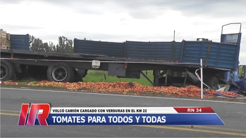 Un camión que transportaba tomates, berenjenas y pimientos, proveniente de la provincia de Salta y con rumbo al Mercado Central, habría sufrido la rotura de una manguera de gasoil, originando ello la salida de la cinta asfáltica y el posterior vuelco del rodado.